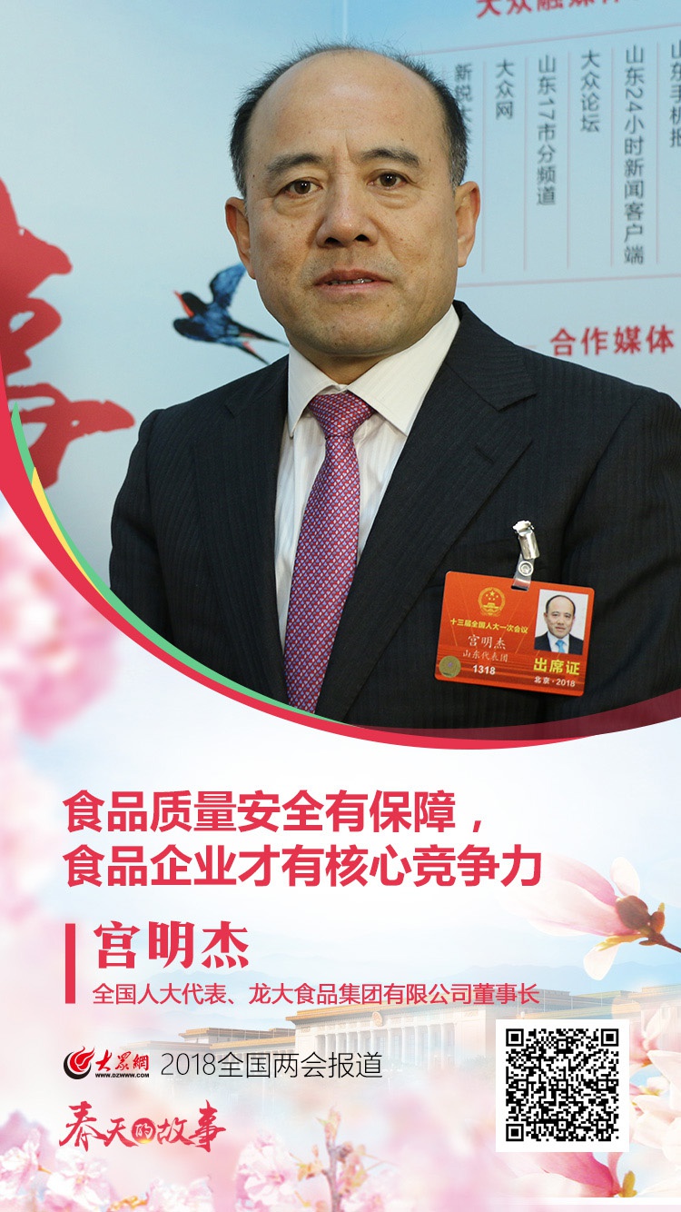 大眾網(wǎng)北京3月12日訊(特派記者 樊思思)“食品安全保證體系實(shí)際上對企業(yè)來說也是一種保障,在這個(gè)體系下生產(chǎn)出的產(chǎn)品,我們可以放心地交給社會,送到消費(fèi)者的餐桌上?!眱蓵陂g,全國人大代表、龍大食品集團(tuán)有限公司董事長宮明杰在做客大眾網(wǎng)“姜洋有約”欄目時(shí)說,綠色源頭建設(shè)、國家級的檢測中心和產(chǎn)品質(zhì)量追溯體系,是龍大打造食品安全體系的三大“法寶”,這也是龍大占居食品行業(yè)領(lǐng)先地位的核心競爭力。