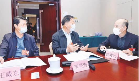 3月9日,參加山東代表團(tuán)分組會(huì)議后,王威東、李登海、宮明杰(自左至右)等代表就藥品、種子、食品等安全問題展開熱烈討論。(來源大眾日?qǐng)?bào)04版 記者房賢剛)