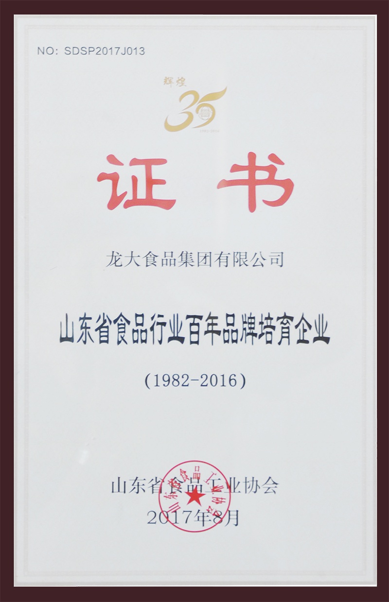 龍大榮獲“山東食品行業(yè)百年品牌培育企業(yè)”稱號(hào)