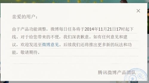 11月21日消息,騰訊微博發(fā)布公告稱,由于產(chǎn)品功能調(diào)整,微博每日任務(wù)將于11月21日17時起下線,這也表示騰訊微博在日常運營方面的進(jìn)一步減少投入。