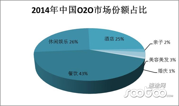 2014年國(guó)內(nèi)的O2O市場(chǎng)中,餐飲行業(yè)市場(chǎng)份額占比高達(dá)43%,居首位。休閑娛樂(lè)類市場(chǎng)份額占26%排名第二,酒店服務(wù)市場(chǎng)份額以微小差距排