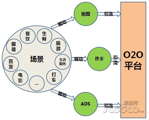 首先,O2O平臺(tái)借助地圖、搜索、ADS等的驅(qū)動(dòng),將產(chǎn)生用戶需求的場(chǎng)景包括餐飲、服裝、百貨、電影、旅游、生活服務(wù)、打車、生鮮等等引入到了O2O平臺(tái)上面來(lái),打通了用戶和O2O平臺(tái)之間的供求渠道。即用戶在O2O平臺(tái)上可以通過(guò)搜索、地圖、ADS等入口,查找自己所需要的服務(wù)類別。