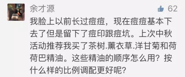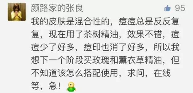 因?yàn)樯眢w對功效型的護(hù)膚品、藥品等會產(chǎn)生“抗性”,長時間單一使用會讓效果變差。所以單一精油或同一精油配方建議三周更換1次配方或比例。建議日常除了直接用茶樹精油直接點(diǎn)涂痘痘救急外,平時可用1滴茶樹精油+2滴薰衣草精油+10ml荷荷巴精油混合稀釋調(diào)理痘痘?。看稳?滴左右避開眼周全臉使用)。