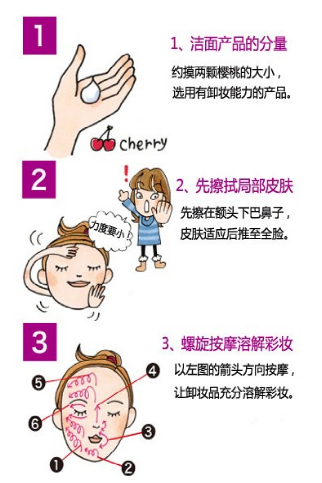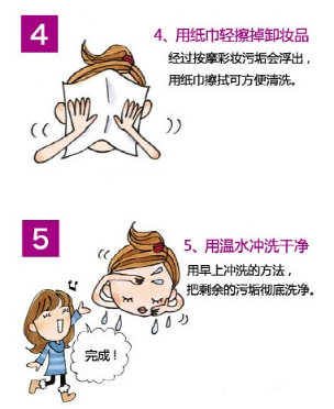 晚上洗臉重點:徹底卸妝并按摩皮膚促進新陳代謝。